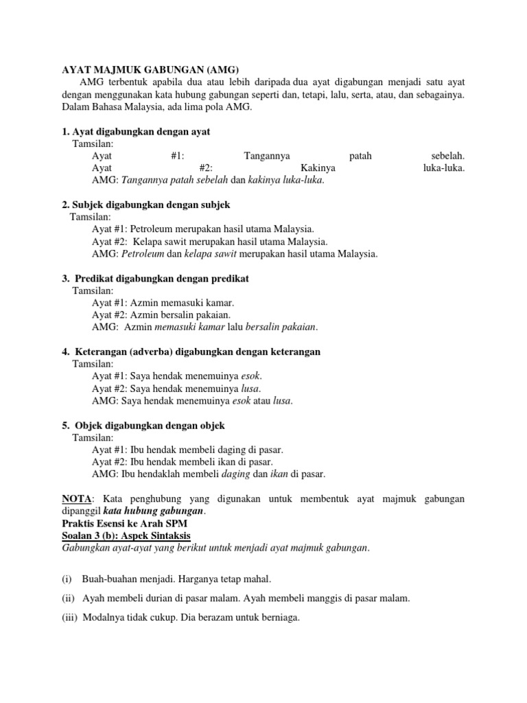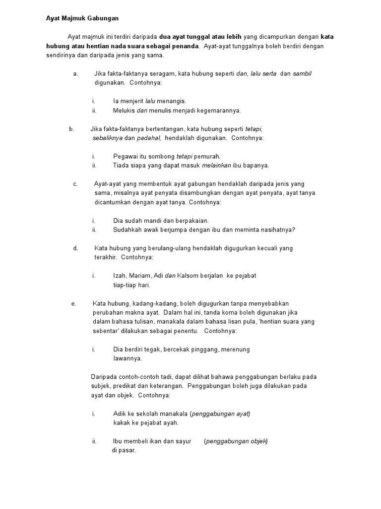 Contoh ayat majmuk gabungan bertentangan :a) ayahnya rajin berniaga tetapi anaknya tidak berminat sama sekali.b) musim hujan dingin, sebaliknya musim kemarau panas. Contoh ayat majmuk gabungan tingkatan 3 contoh 36. Gabungan yang susunannya menggabungkan dua ayat atau lebih, menggunakan kata hubung yang berpasangan seperti lebih baik…daripada, apakah…ataupun, sama ada…atau dan sebagainya. 3.1.1 ayat majmuk gabungan berurutan ayat majmuk jenis ini adalah ayat majmuk yang disusun secara berurutan yakni satu demi satu. Ayat majmuk gabungan ialah ayat yang terdiri daripada dua atau lebih ayat tunggal. Ayat majmuk campuran ialah ayat yang mengandungi lebih daripada satu jenis ayat.ayat ini mungkin terdiri daripada ayat tunggal dan ayat majmuk gabungan atau ayat majmuk pancangan.biasanya, ayat jenis ini panjang.panjang pendek bukanlah kriteria ayat majmuk campuran tetapi bilangan subjek dan predikatnya atau bilangan klausanya. 1) ayat majmuk gabungan sanah, milah, jenab, semek, liah, lebar, dan kiah berada di tanah bermain masak masak nasi pasir dan periuk tempurung.2) ayat majmuk pancangan 2.1) ayat majmuk relatif rumah yang baru dibina itu sudah. I)ayat majmuk pancangan relatif menggunakan kata hubung yang. Perutnya lapar tetapi dia hilang selera. Ayat majmuk gabungan digabungkan dengan menggunakan kata hubung gabungan seperti dan, serta, atau, tetapi, sambil dan sebagainya. Contoh ayat majmuk gabungan pancangan dan campuran contoh ilb. (aktif) surat saya taip dan laporan ditulis oleh amira. <ul><li>jawapan contoh (ii) </li></ul><ul><li>ayat majmuk gabungan :