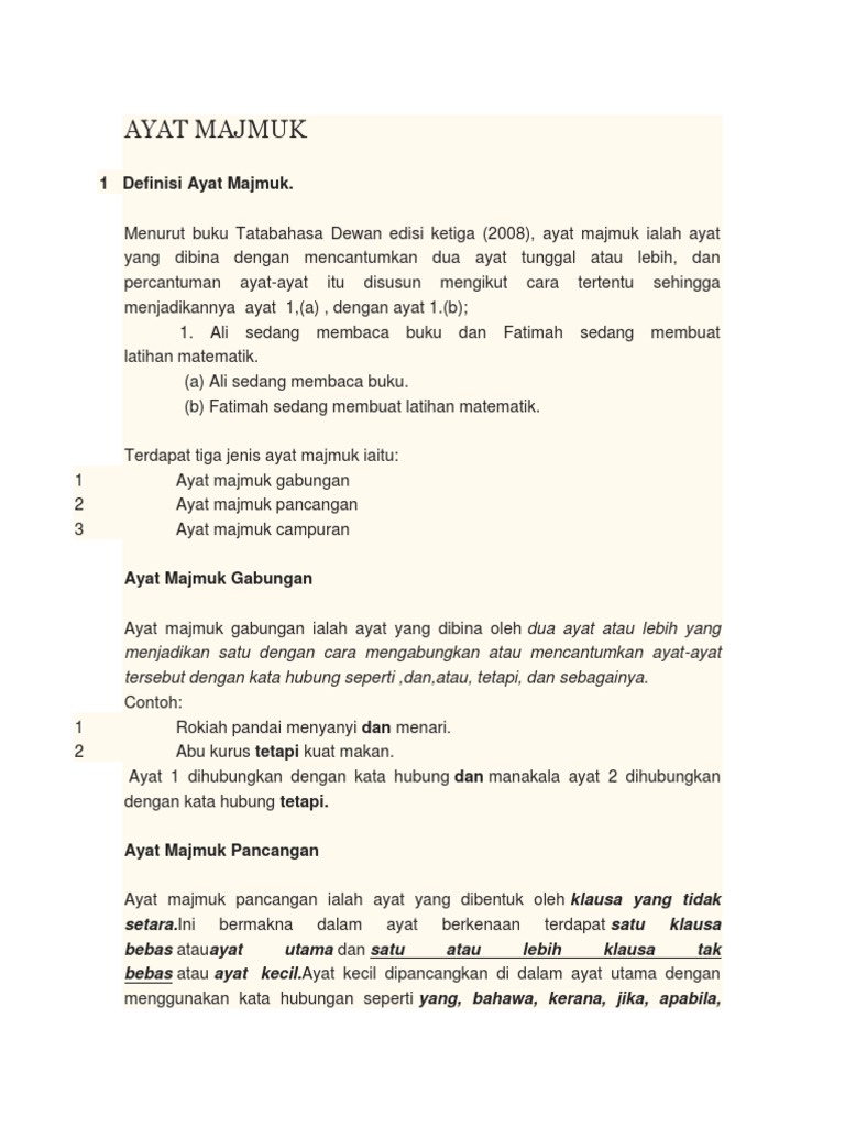 3.1.1 ayat majmuk gabungan berurutan ayat majmuk jenis ini adalah ayat majmuk yang disusun secara berurutan yakni satu demi satu. Ayat majmuk pancangan ialah ayat yang terbina daripada gabungan beberapa ayat tunggal dengan menggunakan kata hubung pancangan seperti agar, bahawa, jika, untuk, ketika, semasa, setelah, semenjak, selagi, selama, supaya, hingga, walaupun. Contoh ayat majmuk gabungan bertentangan :a) ayahnya rajin berniaga tetapi anaknya tidak berminat sama sekali.b) musim hujan dingin, sebaliknya musim kemarau panas. Klausa klausa itu digabungkan dengan menggunakan kata hubung dan, lalu, lagi, serta. Contoh ayat majmuk menggunakan perkataan malahan sumpah pemuda 17.