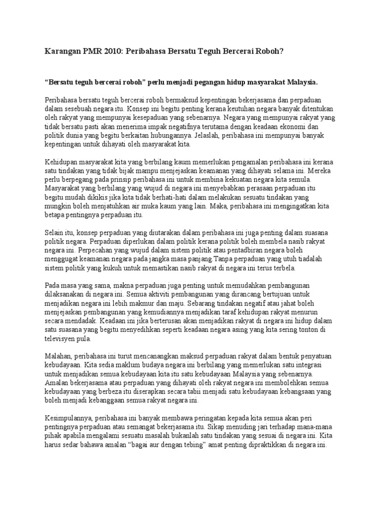Bersatu Teguh Bercerai Roboh Berita Wacana Beritaharian Sg from static.beritaharian.sg Posted by bahasaku indah at 12:45 ptg. Sekiranya kita bersatu dan berkerjasama maka kita dapat berjaya atau menang. 3 :rakyat akan bersatu jika mereka berada dalam kesusahan.dengan kenaikan harga minyak ini munkin akan mengukuhkan lagi kekuatan parti yang betul betul berjuang untuk kebajikan rakyat. Bersatu teguh bercerai roboh,pemimpin yang tidak mampu mempertahankan hak islam dan hak melayu merupakan pemimpin yang lemah dan lesu. Bersatu kita teguh, bercerai kita runtuh artinya: 1 berkumpul (bertaut, bergabung) menjadi satu: Lihat pertarungan di antara anak kerbau dengan bebrapa ekor singa. Bersatu teguh, bercerai roboh :